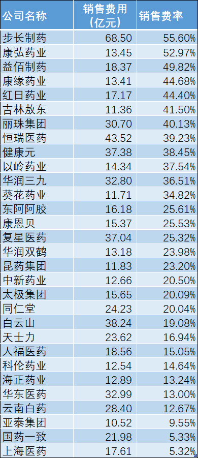在2019这一年中,国内A股药企销售费用前30位中,平均的销售费用投入约为22.54亿元人民币,平均的销售费率为27.49%。