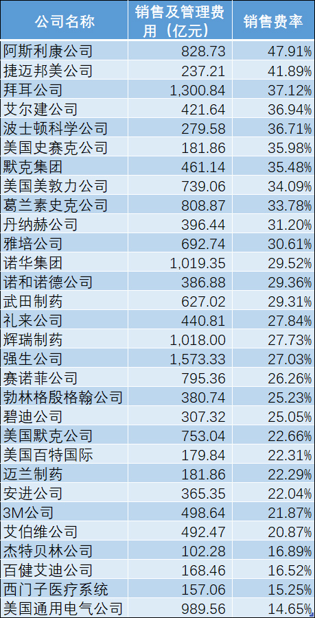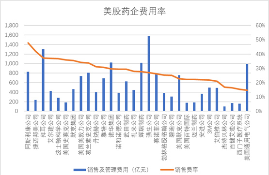 相比较来说,美股上市的药企前三十位中在销售及管理方面的投入平均约为559.52亿元人民币,平均销售费率为28.15%。