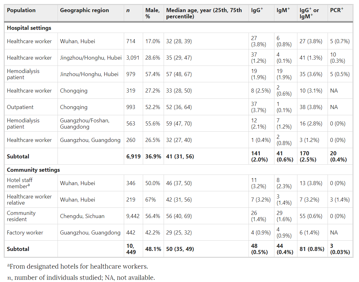 此外,重庆市319名医护人员和993名门诊患者的血清阳性率分别为3.1%和3.8%;成都市9442名居民血清学阳性率为0.58%;广州和佛山的563名就医患者、260医护人员以及442工厂员工的血清阳性率分别为2.8%、1.2%、和1.4%。