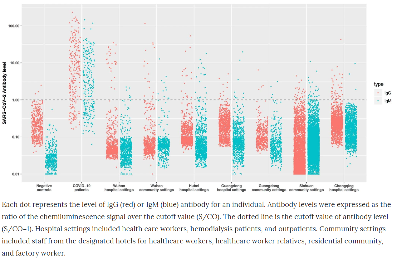 在这项研究中,研究人员首先对血清学检测方法进行了内部验证,确认其针对IgG和IgM抗体的特异性分别为99.3%和100%。随后,在2020年3月9日至4月10日期间,研究人员对来自澳门、香港、湖北、四川、重庆、广东等多个地区的共17368人进行了血清学的分析。
