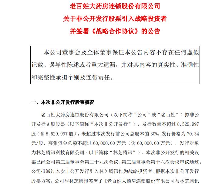 近日,老百姓大药房发布公告称,拟通过非公开发行引入林芝腾讯作为战略投资者,发行数量不超过约853万股,发行价格为70.34元/股,募集资金总额不超过6亿元,所募资金全部用于偿还银行贷款。