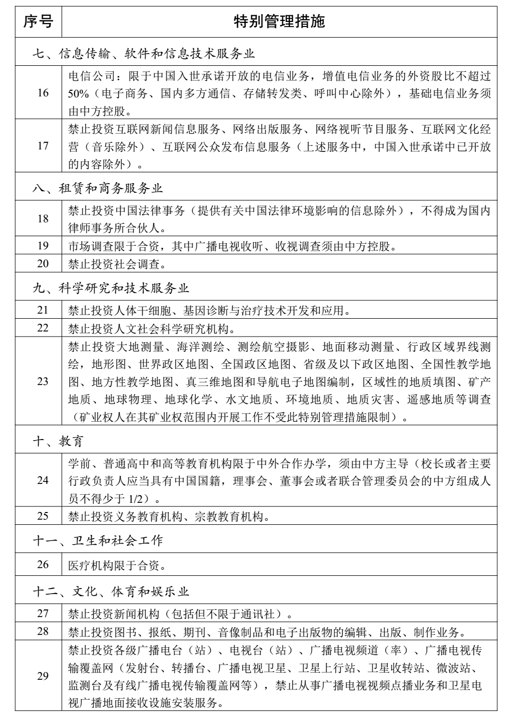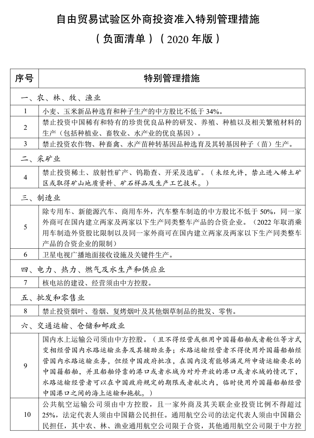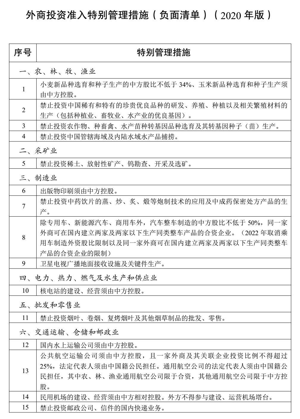 经党中央、国务院同意,国家发展改革委、商务部于2020年6月23日发布第32号令和第33号令,分别发布了《外商投资准入特别管理措施(负面清单)(2020年版)》和《自由贸易试验区外商投资准入特别管理措施(负面清单)(2020年版)》,自2020年7月23日起施行。《外商投资准入特别管理措施(负面清单)(2019年版)》和《自由贸易试验区外商投资准入特别管理措施(负面清单)(2019年版)》同时废止。