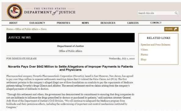 美国司法部官网7月1日发布通告,诺华公司支付6.42亿美元,以了结对病人和医生的不当付款指控。总部位于新泽西州东汉诺威的制药公司诺华制药公司(Novartis)已同意支付6.42亿美元的单独和解金,以解决其违反“虚假索赔法”(FCA)的指控。第一个和解涉及该公司涉嫌非法使用三个基金会作为支付参加诺华公司药品Gilenya和Afinitor的医疗保险病人的费用的渠道。第二项和解解决了该公司据称支付给医生的回扣引起的索赔。