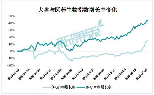 以下选取2020年1月2日为基准日,计算出沪深300和医药生物指数的涨跌幅情况。此次牛市之前,沪深300指数基本处于稳定横盘的状态,而医药生物板块指数则行情看涨。而在6月底之后,股市行情爆发,大盘指数增长率持续拉升,增速迅猛;医药板块此时的指数虽保持良好增速,却不如大盘强劲。