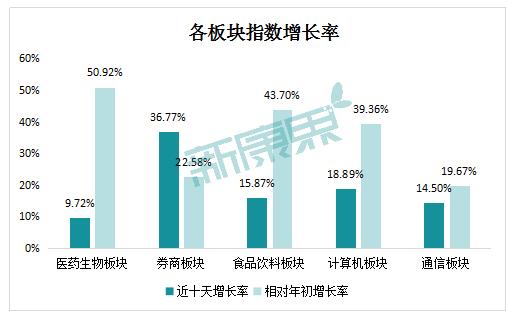 此次股市的暴涨又是由券商板块身先士卒,带动大盘上涨。在申万一级行业的板块指数中,食品饮料板块、计算机板块和通信板块在这次盛态下的涨幅居前。在这里我们选取这几个板块与医药生物板块,对它们近十天以及相对年初的指数增长率进行比较。