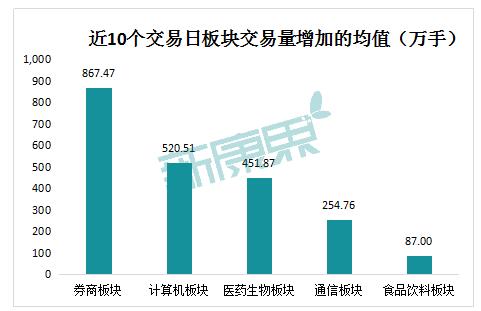 选取股市开始连续攀升的6月29日以来的10个交易日,计算出不同板块交易量日增加额的平均值。券商板块的平均增加的交易量最高,达到867.47万手,计算机板块和医药生物板块以520.51和451.87万手位列二、三。