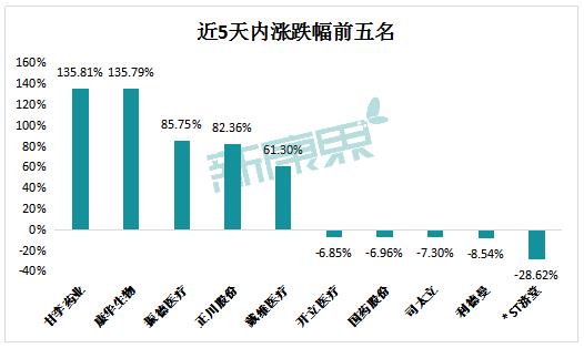 医药生物板块307支股票中,281支上涨,26支下跌。近5天涨幅超过100%的有两家,均是刚上市还未开盘的企业——胰岛素巨头甘李药业以及国内首家生产人二倍体细胞狂犬病疫苗的康泰生物,两者涨幅分别高达135.81%和135.79%,相差无几。涨幅紧随其后的是振德医疗、正川股份和戴维医疗——均是医疗器械类的企业。跌幅前五的企业中只有ST济堂(即新疆同济堂)的跌幅超过了10%,其余的都是在10%内小幅下跌。