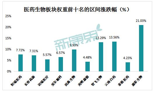 龙头企业均表现良好。从板块权重前十名企业的涨跌幅来看,它们近5天股价都是上升的。“医药一哥”恒瑞医药权重约10%,大大影响着医药板块指数的变化,其涨幅7.72%。其中涨幅超过10%的企业有三家,分别是智飞生物、云南白药和康泰生物,其中双栖疫苗领域以及体外诊断的康泰生物以21.03%的涨幅成为权重前十名中的第一。