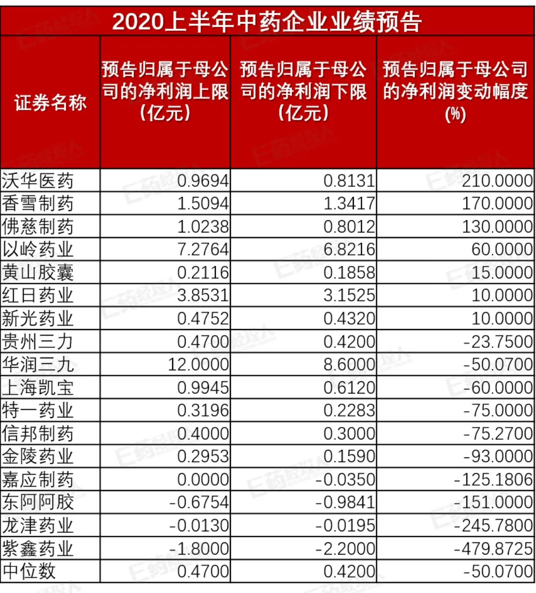 尽管疫情期间连花清瘟、血必净等中药被广泛用于新冠肺炎的治疗方案中,以岭药业、红日药业也分别以60%和10%的净利润增幅位列上半年中药行业净利润增幅TOP10。但从整体情况看,行业净利润变动幅度中位数仍为-50.7%,其中,紫鑫药业降幅甚至高达479.87%。