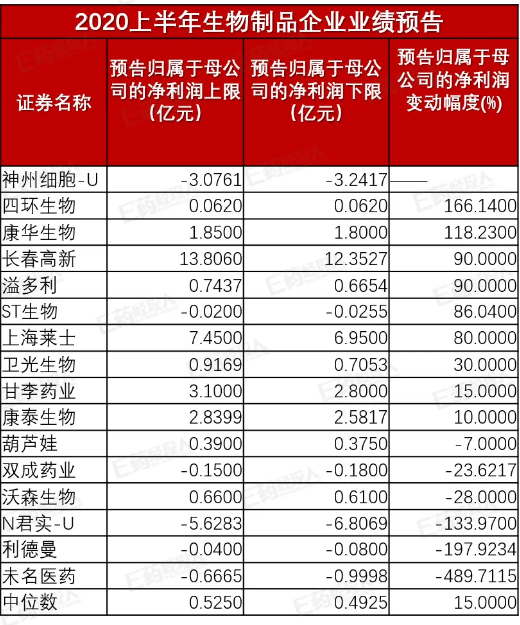 E药经理人统计了截至2020年7月15日24时A股医药生物板块(申万行业分类)披露的2020年上半年业绩预告的信息,供行业人士参考。