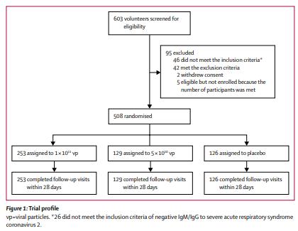 据了解,此次二期临床试验于今年4月12日在武汉启动,这也是当时全球唯一进入二期临床试验的新冠疫苗,该临床试验采用随机、双盲、安慰剂对照设计,共计有508人受试者参与,被随机分配至疫苗组和安慰剂组,分别接种10e11 VP(n=253),5e10 VP(n=129)或安慰剂(n=126),该研究的主要目的是评估疫苗的免疫反应和安全性,并确定适合三期试验的剂量。
