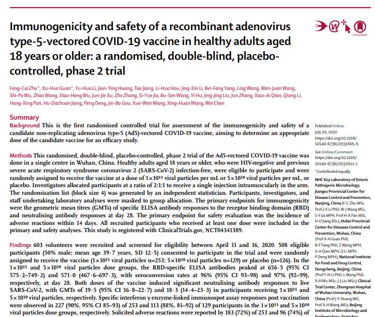 昨日晚间(7月20日),世界知名医学期刊《柳叶刀》杂志公布了中国工程院院士陈薇团队研发的新冠疫苗(腺病毒载体)(Ad5-nCoV)II期临床试验结果,结果显示疫苗安全,且可以诱导免疫反应,这也是全球首个正式发表的新冠疫苗Ⅱ期临床试验数据。