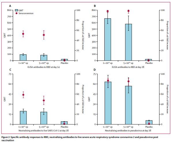 结果显示,接种后28天,10e11和5e10VP组血清抗体阳性率分别为96%和97%,并产生了高滴度RBD IgG,而安慰剂受试组则没有发生变化。同时,高剂量组和低剂量组均产生了中和抗体,参与者中和抗体的中和活性的几何平均滴度(GMT)分别为19.5和18.3,90%的10e11VP组产生了特异性IFN-g,88%的5e10VP组产生了特异性IFN-g,提示该疫苗诱导了T细胞应答。