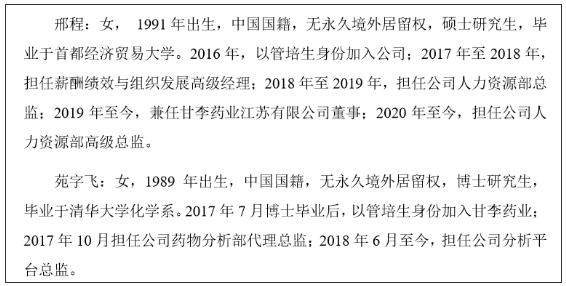 此外,本次人事变动值得注意的一点是,有两位年轻的管培生升任公司副总。1991年出生的邢程原为甘李药业董事和人力资源部高级总监,于2016年以管培生身份加入甘李,而另一位管培生苑字飞2017年毕业后加入甘李,先后担任药物分析部代理总监、分析平台总监。