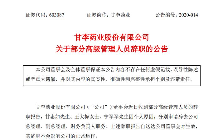 7月21日晚间,甘李药业发布公告称,董事会近日收到部分高级管理人员的辞职报告,甘忠如先生、王大梅女士、宁军军先生因个人原因,分别申请辞去公司总经理、副总经理、财务负责人职务。辞职后,甘忠如先生仍担任公司董事长、战略委员会主任委员、薪酬与考核委员会委员,王大梅女士仍担任公司董事,宁军军先生仍在公司财务部从事财务管理工作。甘忠如先生和王大梅女士在辞任公司高级管理人员之后将带领研发团队全身心投入公司的新产品研发和技术创新工作。