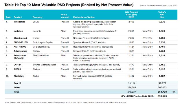 备受期待的同时,该药也备受争议。在2018年最有价值TOP10新药项目中位列首位,但在去年的TOP10榜单中下滑至第6位,净现值下降一半至53.61亿美元,今年同样是第6位,净现值不变。这在一定程度上反映了行业对该药前景的不确定性。