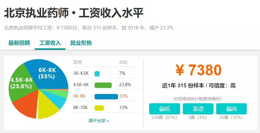 当然,笔者也从各地薪酬数据了解到,除北京、上海等特殊城市外,现今国内各地执业药师薪酬还普遍偏低,平均薪酬3000左右的较多。