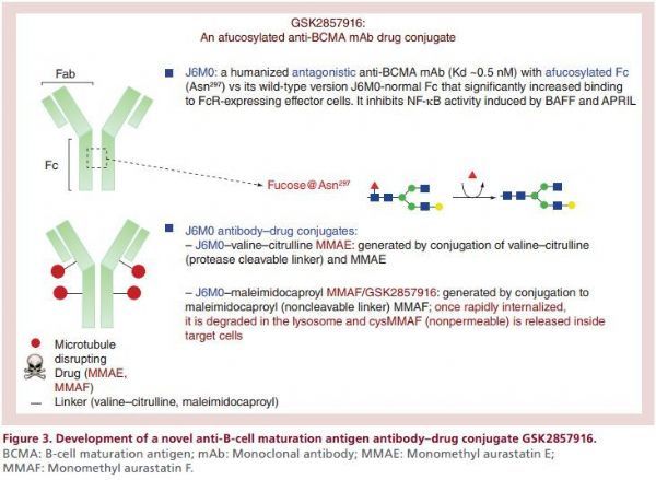 belantamab mafodotin是一种新型人源化Fc-改造过的抗BCMA单抗与细胞毒制剂MMAF(monomethyl auristatin-F)通过一种非裂解链接子(药物链接技术从西雅图遗传学取得授权)偶联而成的ADC药物。belantamab mafodotin通过抗BCMA单抗靶向结合MM细胞表面的BCMA,之后迅速被MM细胞内化,在溶酶体中降解并在MM细胞内释放出非渗透性的MMAF发挥作用。MMAF是一种有丝分裂抑制剂,为抗微管蛋白化合物,能通过阻断微管聚合抑制细胞分裂,可使肿瘤细胞停止于G/M期并诱导caspase-3依赖的细胞凋亡。此外,belantamab mafodotin还能诱导NK细胞介导的ADCC(抗体依赖性细胞介导的细胞毒性作用),同时诱导巨噬细胞介导ADCP(抗体依赖性细胞介导的吞噬作用)。