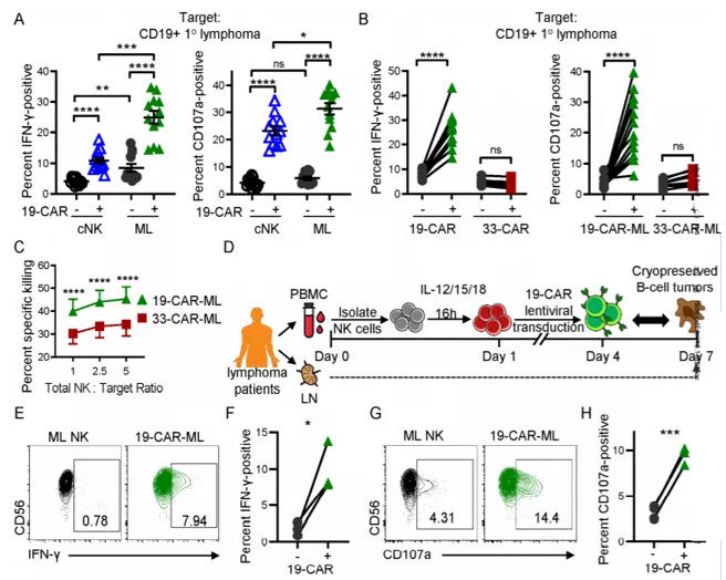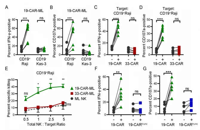 CAR-ML NK细胞显示出增强的抗肿瘤细胞系的抗原(CD19)特异性应答(图片来源:Blood)