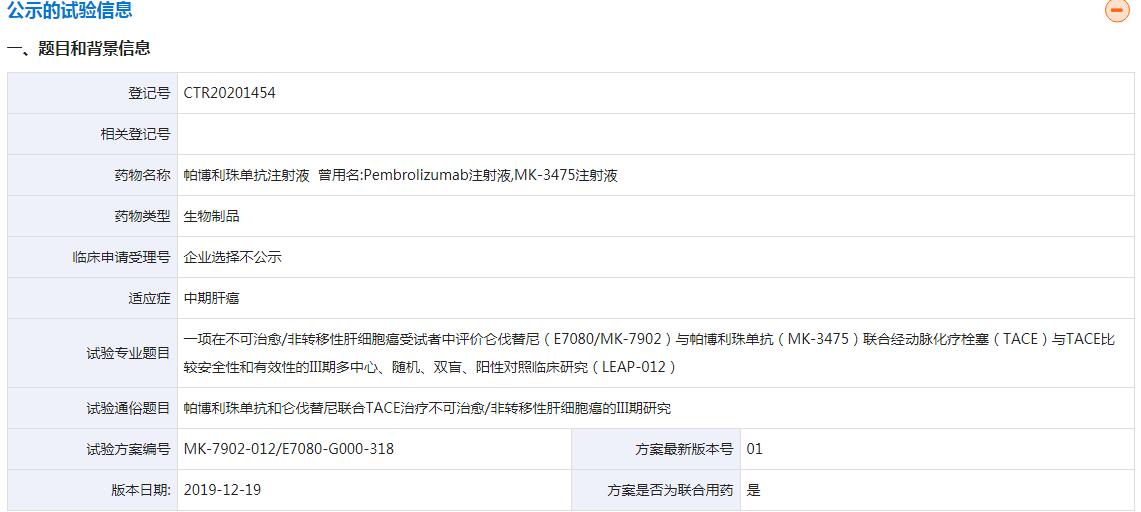 另一项是在不可治愈/非转移性肝细胞癌受试者中评价仑伐替尼(E7080/MK-7902)与帕博利珠单抗(MK-3475)联合经动脉化疗栓塞(TACE)与TACE比较安全性和有效性的III期多中心、随机、双盲、阳性对照临床研究(LEAP-012),适应症是中期肝癌。