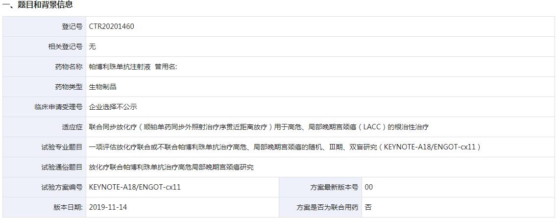 其中,一项为评估放化疗联合或不联合帕博利珠单抗治疗高危、局部晚期宫颈癌的随机、Ⅲ期、双盲研究(KEYNOTE-A18/ENGOT-cx11),适应症是联合同步放化疗(顺铂单药同步外照射治疗序贯近距离放疗)用于高危、局部晚期宫颈癌(LACC)的根治性治疗。