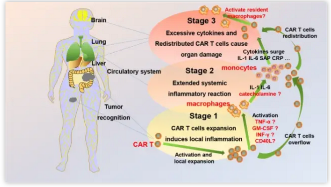 研究团队将在B-NHL患者中由CAR-T细胞引起的CRS发展分为四个阶段:(1)CAR-T细胞局部扩增;(2)CAR-T细胞溢出和炎性细胞因子激增;(3)CAR-T细胞的重新分布和器官损伤阶段;(4)恢复阶段。在该模型中,肿瘤负荷和骨髓抑制(BMS)被认为是CRS的决定因素。