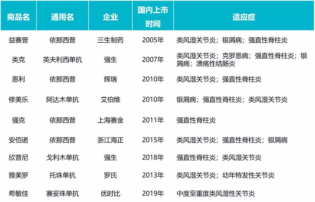 生物制剂抗风湿药物:主要包括依那西普(恩利)、重组人II型肿瘤坏死因子受体抗体融合蛋白(益赛普)、戈利木单抗(欣普尼)、托珠单抗(雅美罗)、阿达木单抗(修美乐)、英夫利西单抗(类克)等,基本都进入医保目录。2019年,生物制剂抗风湿药物在中国的销售收入为37亿元,年复合增长率为31.5%,市场潜力巨大。