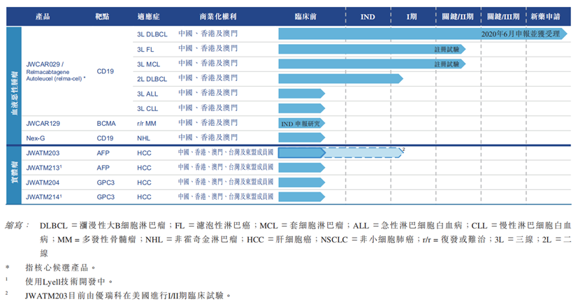 其他候选产品中,JWCAR129为靶向BCMA的CAR-T疗法,据申请书披露计划最早于2021年上半年提交IND申请。