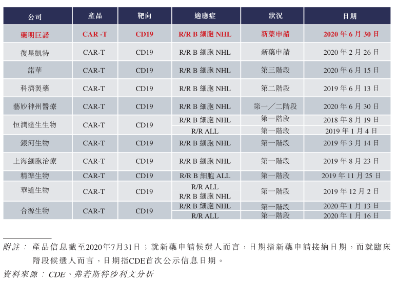 CAR-T 市场的增加,也吸引越来越多的公司入局。截至今年7月,国内已有30多家企业注册申报了50多项CAR-T产品,其中30多项以获得IND批件,而药明巨诺的 JWCAR029 和复星凯特的 FKC876 是其中进展最快的两项,有望在其中诞生中国首个获批的 CAR-T 疗法。