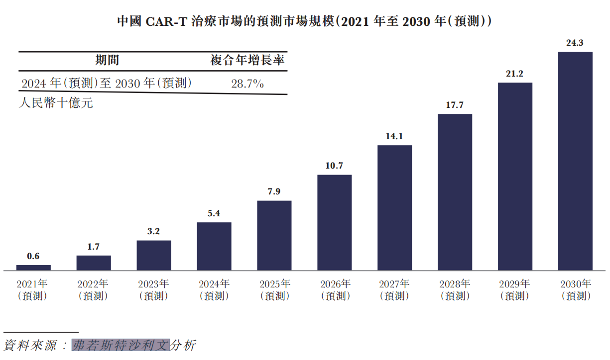 据申请书显示,根据弗若斯特沙利文的报告,由于对可使用CAR-T疗法进行有效治疗的需求仍未被满足,中国CAR-T治疗市场规模预期由2021年的人民币6亿元增至2024年的人民币54亿元,并进一步增至2030年的人民币243亿元。