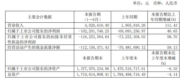 8月24日,在登陆科创板十余天后,康希诺披露了2020年半年报业绩,其上半年实现营业收入402.96万元,同比增长111.43%,归母净利润为-1.02亿元,亏损同比扩大46.65%。