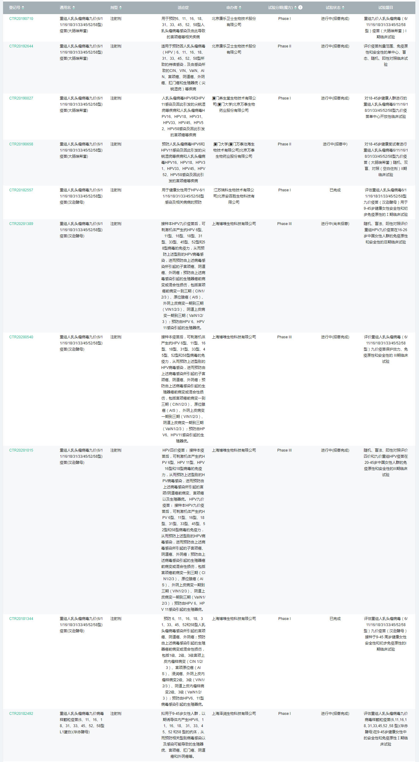 目前,国内已有多家企业布局HPV疫苗市场,由于现阶段我国HPV疫苗市场渗透率最高的为九价HPV疫苗,二价、四价HPV市场渗透率相对较低,因此大多数企业的赛道集中在九价HPV疫苗其中进展较快的包括,博唯生物正在进行III期临床,万泰沧海的III期临床试验正在筹备中,另外,北京康乐卫士生物的九价HPV疫苗目前正处于II期临床阶段,沃森生物的控股子公司润泽生物的九价HPV疫苗也已进入I期临床阶段。