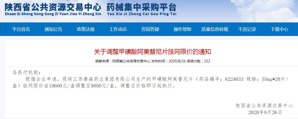 近日,陕西省公共资源交易中心发布一则《关于调整甲磺酸阿美替尼片挂网限价的通知》,通知显示,江苏豪森药业集团有限公司生产的甲磺酸阿美替尼片(55mg*20片/盒)挂网限价由 19600元/盒调整至9800元/盒,调整后价格即日起执行。