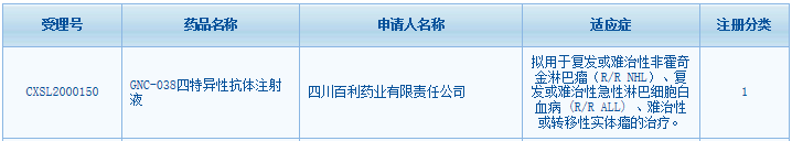 据CDE官网显示,日前,百利药业GNC-038四特异性抗体注射液的临床试验申请获得NMPA默示许可,用于复发或难治性非霍奇金淋巴瘤(R/R NHL)、复发或难治性急性淋巴细胞白血病(R/R ALL)和难治性/转移性实体瘤的治疗。