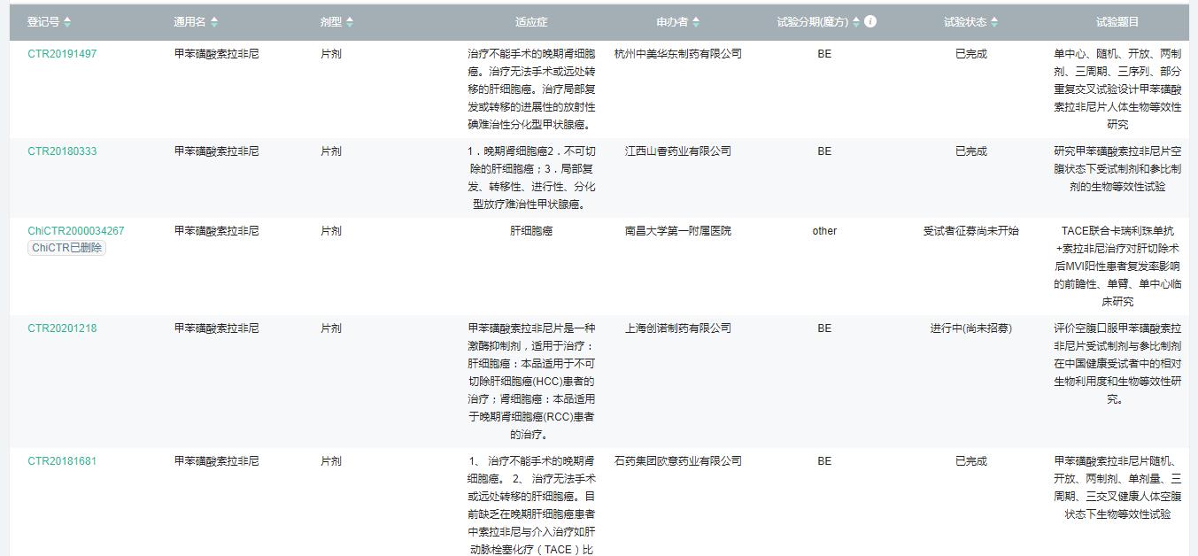 此外,据医药魔方数据库显示,石药欧意、正大天晴、亚宝药业、辅仁药业均也已在布局研发索拉非尼。