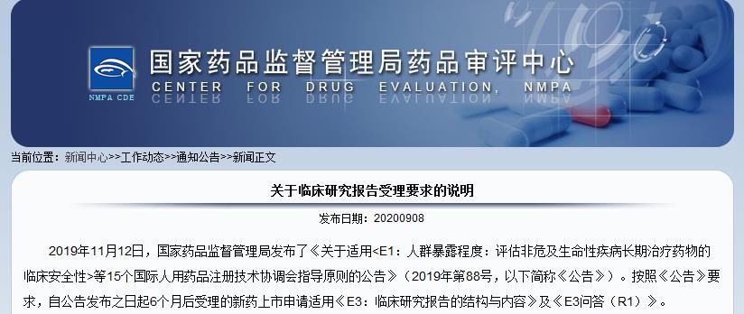 2019年11月12日,国家药品监督管理局发布了《关于适用等15个国际人用药品注册技术协调会指导原则的公告》(2019年第88号,以下简称《公告》)。按照《公告》要求,自公告发布之日起6个月后受理的新药上市申请适用《E3:临床研究报告的结构与内容》及《E3问答(R1)》。