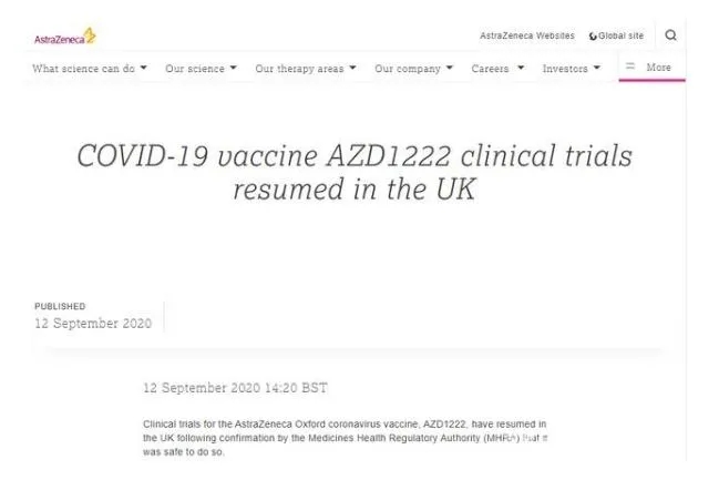 阿斯利康在其官网上也发表声明,称英国恢复了牛津-阿斯利康新冠疫苗AZD1222的临床试验。
