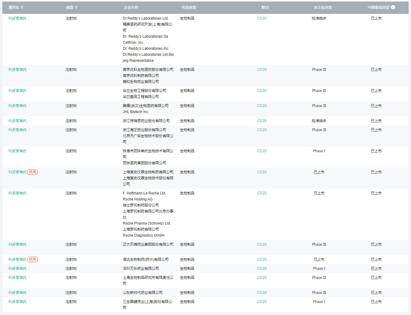 部分开发利妥昔单抗的企业(图片来源:医药魔方PharmaGO数据库)