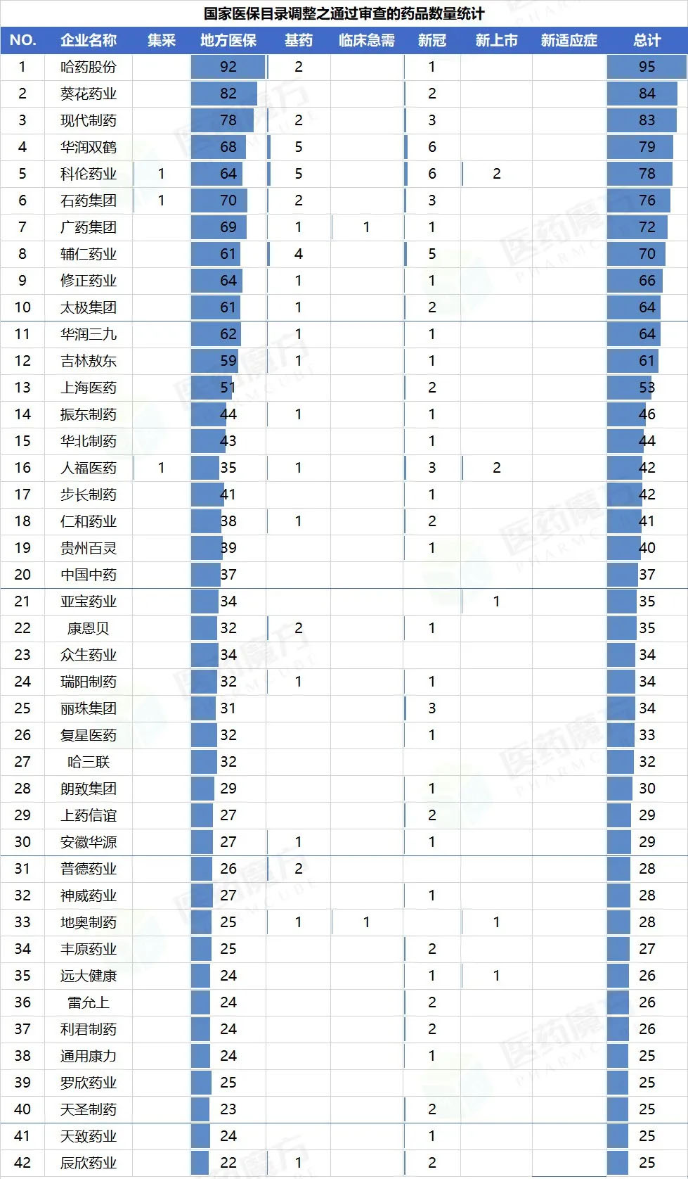 据医药魔方数据显示,哈药股份、葵花药业、现代制药、华润双鹤、科伦药业、石药集团、广药集团、辅仁药业、修正药业、太极集团、华润三九等42家药企通过国家医保目录调整形式审查的药品数量较多。