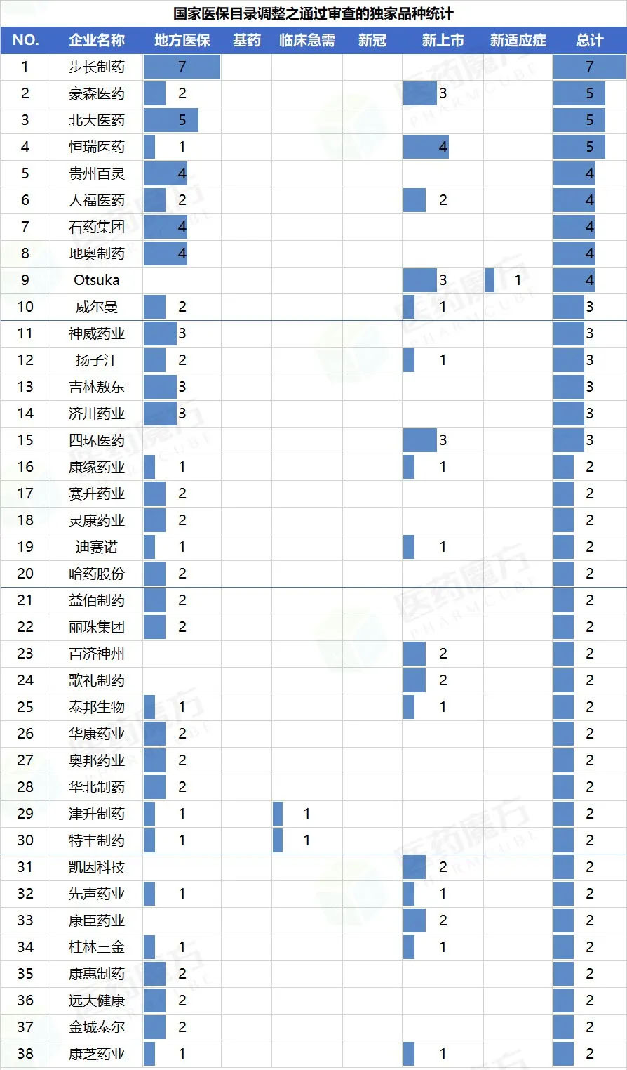 另外,步长制药、豪森医药、北大医药、恒瑞医药、贵州百灵、人福医药、石药集团、地奥制药等38家药企通过国家医保目录调整形式审查的独家品种数量较多。