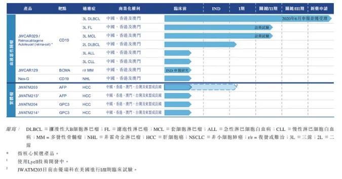 其他产品包括靶向BCMA的CAR-T疗法JWCAR129,据申请书披露计划最早于2021年上半年提交IND申请;Nex-G为靶向CD19的新一代CAR-T疗法,采用了新的技术和平台,据申请书表示,其生产周期更短,质量标准更高;JWATM203为靶向AFP治疗HCC的TCR-T疗法,目前其许可合作伙伴,细胞治疗企业优瑞科已于美国推动其AFP TCR-T细胞疗法候选产品进行I/II期临床试验。靶向GPC3的T细胞疗法JWATM204。
