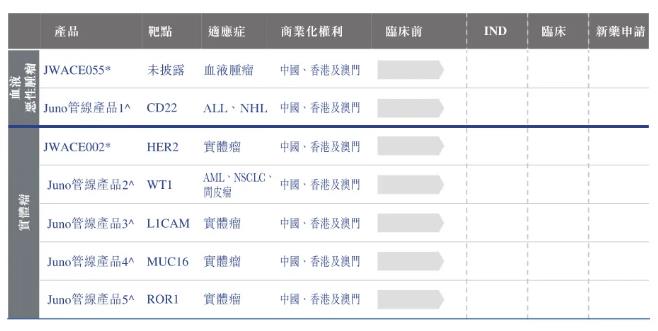 此外,通过相关授权,药明巨诺发展了7款潜在产品管线,主要集中于实体瘤治疗,靶点包括WT1、HER2、L1CAM等。目前,这些产品基本处于临床前阶段。