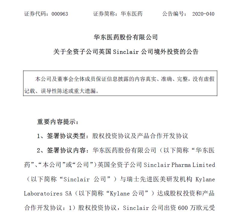 近日,华东医药发布公告称,其全资子公司英国Sinclair公司出资600万欧元受让Kylane公司20%股权。