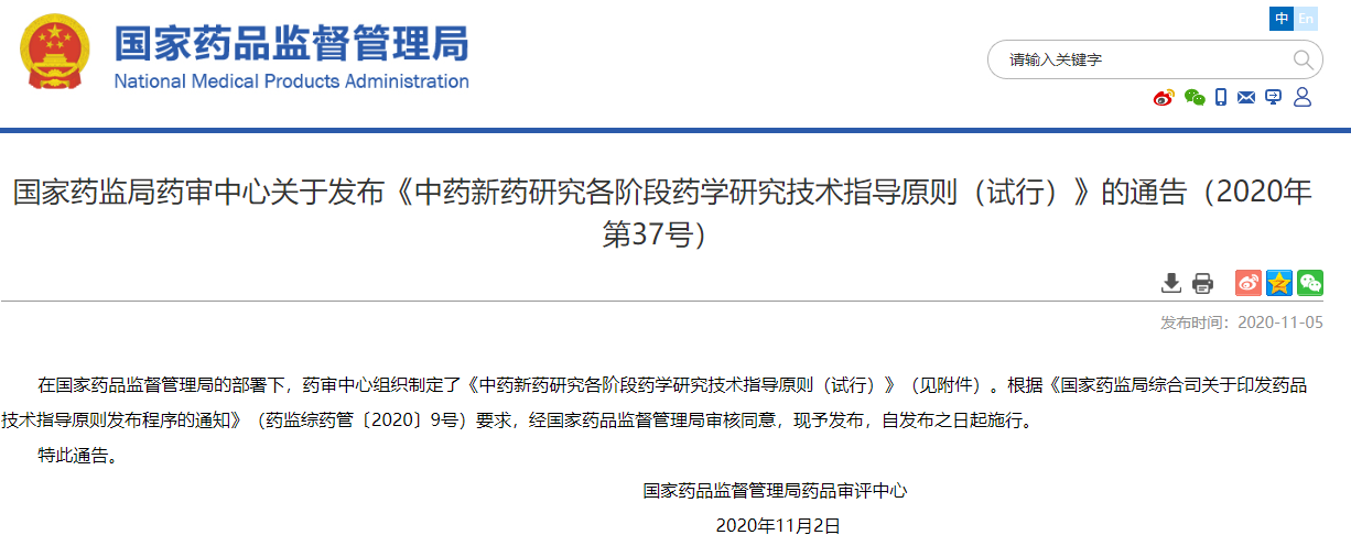 在国家药品监督管理局的部署下,药审中心组织制定了《中药新药研究各阶段药学研究技术指导原则(试行)》(见附件)。指导原则主要针对中药新药申请临床试验、Ⅲ期临床试验前、申请上市许可及上市后研究各阶段需要完成的药学主要研究内容提出基本要求,为中药新药研究提供参考。