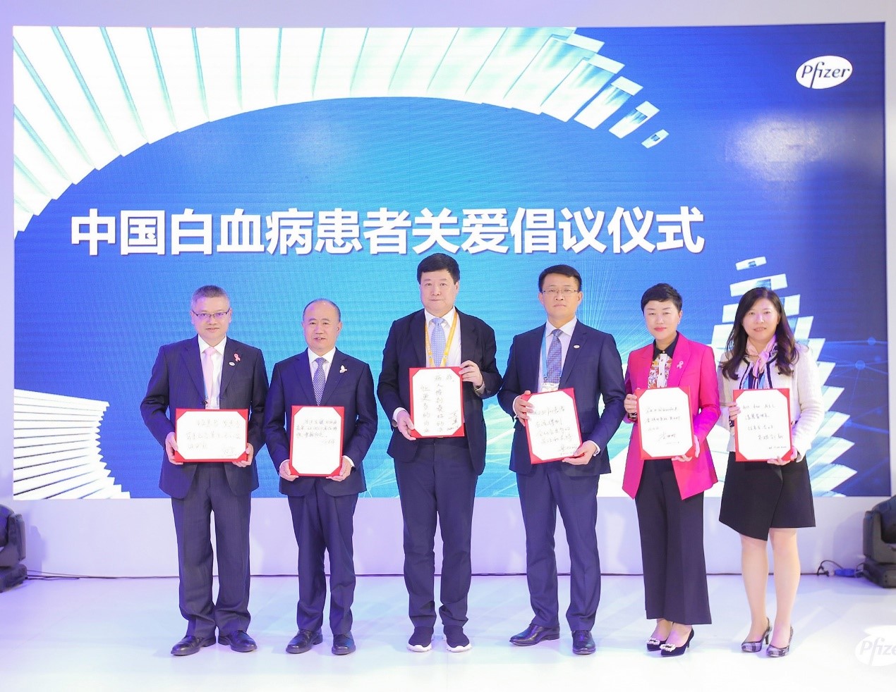 中国白血病患者关爱倡议仪式合影(左起:辉瑞生物制药集团中国区肿瘤市场部负责人宋发贤先生;苏州大学附属第一医院血液科主任吴德沛教授;哈尔滨血液病肿瘤研究所所马军教授;辉瑞生物制药集团中国区副总裁、首席医学官曹峻洋博士;辉瑞生物制药集团中国区肿瘤及罕见病业务总经理李进晖女士;辉瑞生物制药集团中国区市场营销副总裁王怡亲女士)