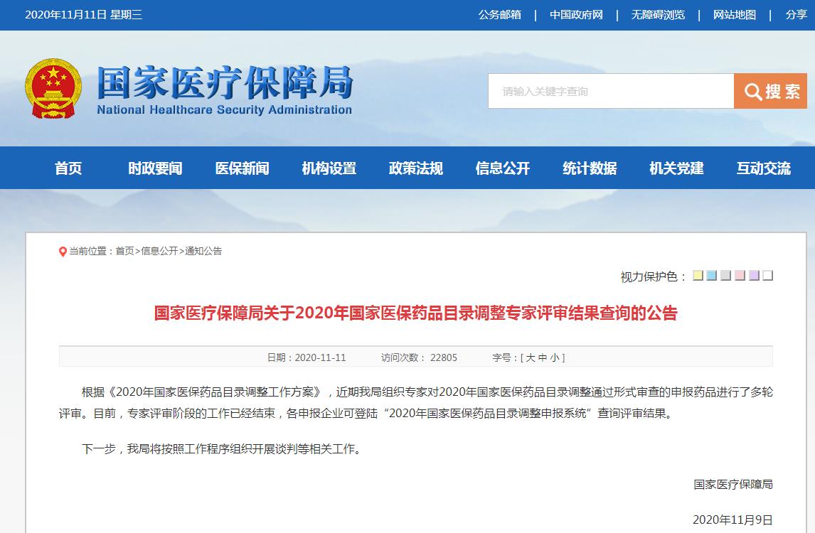 公告称,根据《2020年国家医保药品目录调整工作方案》,近期国家医保局组织专家对2020年国家医保药品目录调整通过形式审查的申报药品进行了多轮评审。目前,专家评审阶段的工作已经结束,各申报企业可登陆“2020年国家医保药品目录调整申报系统”查询评审结果,这也意味着和10月份的形式审查结果一样,最终的结果只有参与企业可以知晓。
