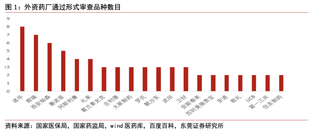 涉及企业方面,据东莞证券统计,外资药企中,规定期间内获批上市的新药中,通过审查数量居前的是诺华、辉瑞、西安杨森和赛诺菲。其中诺华有8个新药通过形式审查,辉瑞有7个新药通过形式审查,西安杨森则有6个新药通过形式审查。