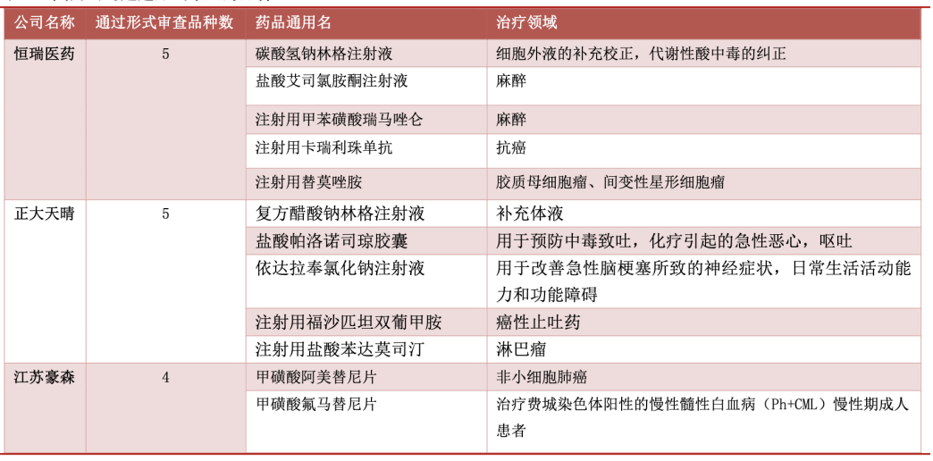 国内企业中,恒瑞医药、正大天晴、江苏豪森的数量居前,分别有5个、5个、4个品种通过形式审查,百济神州、人福医药、歌礼制药、兴齐眼药和科伦药业各有2个品种通过形式审查,复星医药、君实生物、三生制药、再鼎医药、智飞生物等各有1个品种通过形式审查。