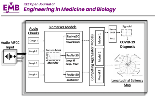 AI 模型则提取了咳嗽记录的音频特征(梅尔频率倒谱系数),并将它输入到神经网络(卷积神经网络,CNN)中,学习新冠病毒患者与健康人之间的咳嗽差异。具体来说,研究人员训练了三个神经网络模型,分别用来提取声带强弱特征、区分言语中情绪状态以及在自建的咳嗽数据集上训练,用来辨别肺和呼吸功能的变化。