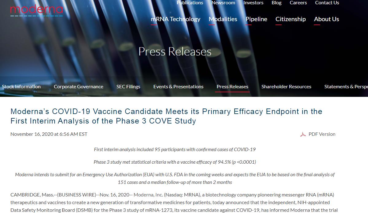 当地时间16日,美国制药企业Moderna公司宣布,根据疫苗三期临床试验早期分析,其研发的新冠疫苗mRNA-1273的有效率达到94.5%,高于同为mRNA新冠候选疫苗(由辉瑞和BioNTech合作研发)BNT162b2一周前公布的90%的有效率。